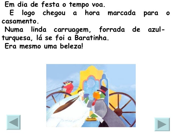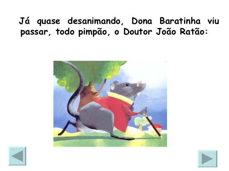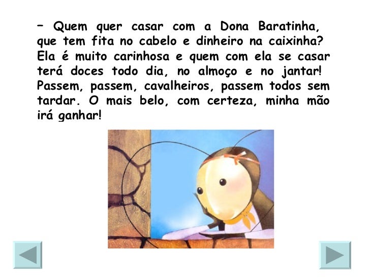 3. 3. – Quem quer casar com a Dona Baratinha, que tem fita no cabelo e dinheiro na caixinha? Ela é muito carinhosa e quem com ela se casar terá doces todo dia, no almoço e no jantar! Passem, passem, cavalheiros, passem todos sem tardar. O mais belo, com certeza, minha mão irá ganhar!