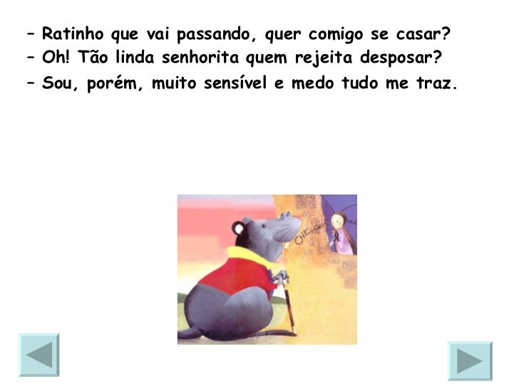13. 13. <ul><li>– Ratinho que vai passando, quer comigo se casar? </li></ul><ul><li>– Oh! Tão linda senhorita quem rejeita desposar? </li></ul><ul><li>– Sou, porém, muito sensível e medo tudo me traz. </li></ul>