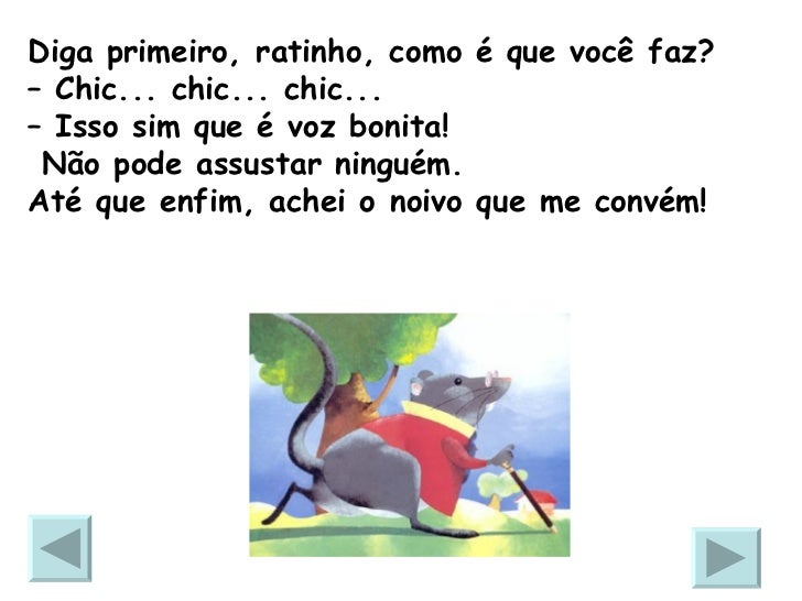 14. 14. Diga primeiro, ratinho, como é que você faz? – Chic... chic... chic... – Isso sim que é voz bonita! Não pode assustar ninguém. Até que enfim, achei o noivo que me convém!