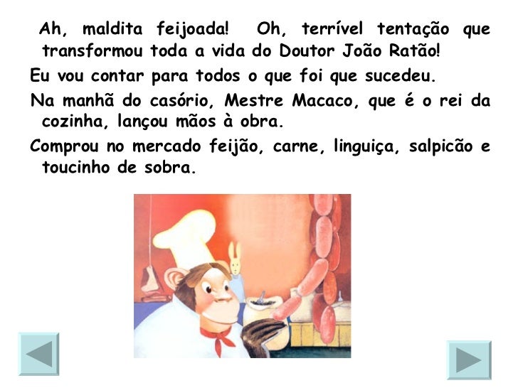 16. 16. <ul><li>Ah, maldita feijoada! Oh, terrível tentação que transformou toda a vida do Doutor João Ratão! </li></ul><ul><li>Eu vou contar para todos o que foi que sucedeu. </li></ul><ul><li>Na manhã do casório, Mestre Macaco, que é o rei da cozinha, lançou mãos à obra. </li></ul><ul><li>Comprou no mercado feijão, carne, linguiça, salpicão e toucinho de sobra. </li></ul>