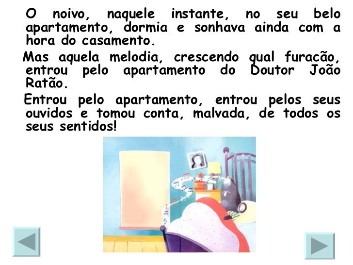 19. 19. <ul><li>O noivo, naquele instante, no seu belo apartamento, dormia e sonhava ainda com a hora do casamento. </li></ul><ul><li>Mas aquela melodia, crescendo qual furacão, entrou pelo apartamento do Doutor João Ratão. </li></ul><ul><li>Entrou pelo apartamento, entrou pelos seus ouvidos e tomou conta, malvada, de todos os seus sentidos! </li></ul>