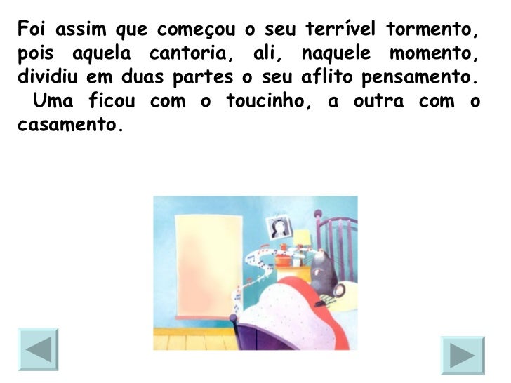 21. 21. <ul><li>Mas a ideia do toucinho cresceu na sua cabeça. </li></ul><ul><li>Tanto cresceu que acabou dando lhe tratos à bola. </li></ul><ul><li>Tomou formas variadas, de uma roda, de um canudo, de uma onda e tomou conta de tudo! </li></ul><ul><li>Entretanto a outra ideia, a ideia do casamento, foi mingando, mingando... que fugiu seu pensamento! </li></ul>