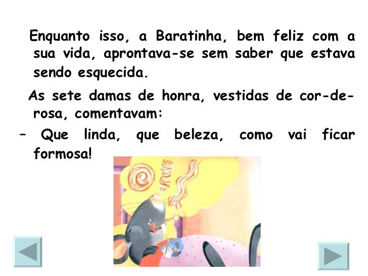 22. 22. <ul><li>Enquanto isso, a Baratinha, bem feliz com a sua vida, aprontava-se sem saber que estava sendo esquecida. </li></ul><ul><li>As sete damas de honra, vestidas de cor-de-rosa, comentavam: </li></ul><ul><li>– Que linda, que beleza, como vai ficar formosa! </li></ul>