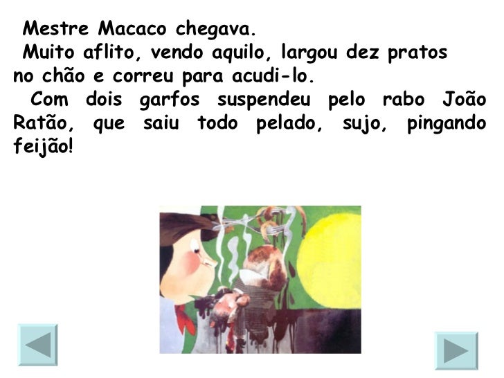 32. 32. Mestre Macaco chegava. Muito aflito, vendo aquilo, largou dez pratos no chão e correu para acudi-lo. Com dois garfos suspendeu pelo rabo João Ratão, que saiu todo pelado, sujo, pingando feijão!
