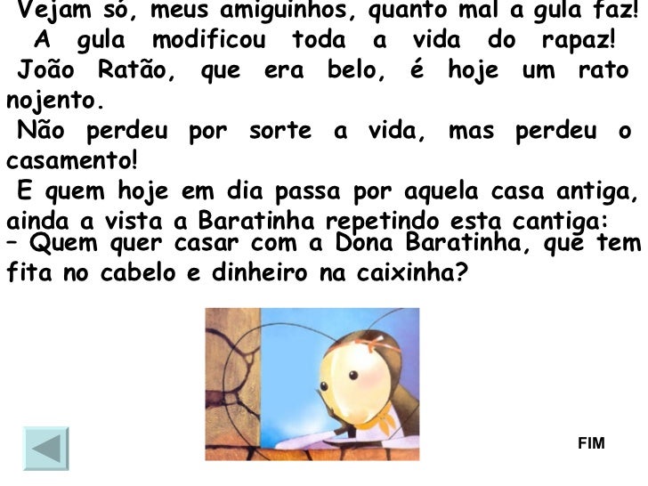 33. 33. Vejam só, meus amiguinhos, quanto mal a gula faz! A gula modificou toda a vida do rapaz! João Ratão, que era belo, é hoje um rato nojento. Não perdeu por sorte a vida, mas perdeu o casamento! E quem hoje em dia passa por aquela casa antiga, ainda a vista a Baratinha repetindo esta cantiga: – Quem quer casar com a Dona Baratinha, que tem fita no cabelo e dinheiro na caixinha? FIM