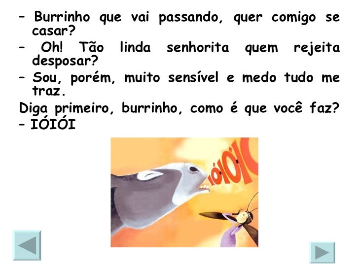 7. 7. <ul><li>– Burrinho que vai passando, quer comigo se casar? </li></ul><ul><li>– Oh! Tão linda senhorita quem rejeita desposar? </li></ul><ul><li>– Sou, porém, muito sensível e medo tudo me traz. </li></ul><ul><li>Diga primeiro, burrinho, como é que você faz? </li></ul><ul><li>– IÓIÓI </li></ul>