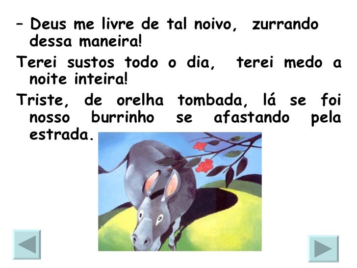 8. 8. <ul><li>– Deus me livre de tal noivo, zurrando dessa maneira! </li></ul><ul><li>Terei sustos todo o dia, terei medo a noite inteira! </li></ul><ul><li>Triste, de orelha tombada, lá se foi nosso burrinho se afastando pela estrada. </li></ul>