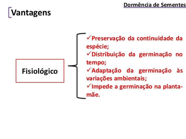 4. 4. Dormência de Sementes Fisiológico Vantagens Preservação da continuidade da espécie; Distribuição da germinação no tempo; Adaptação da germinação às variações ambientais; Impede a germinação na planta- mãe.