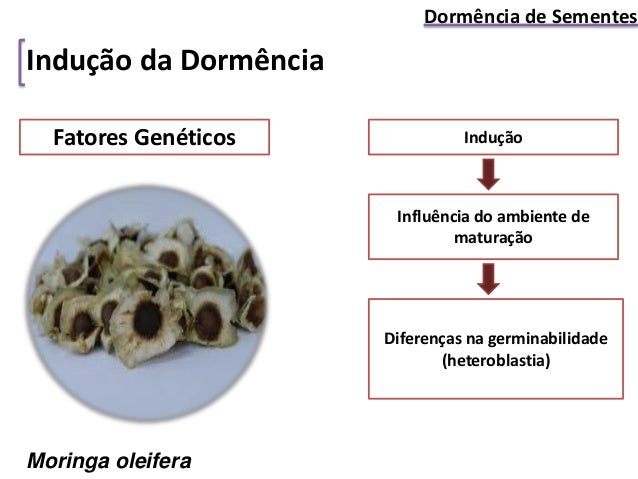 6. 6. Fatores Genéticos Indução Influência do ambiente de maturação Diferenças na germinabilidade (heteroblastia) Indução da Dormência Dormência de Sementes Moringa oleifera