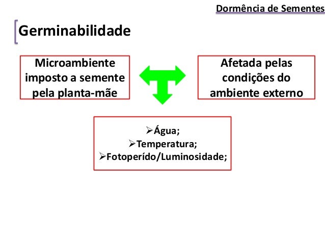 7. 7. Afetada pelas condições do ambiente externo Microambiente imposto a semente pela planta-mãe Água; Temperatura; Fotoperído/Luminosidade; Dormência de Sementes Germinabilidade