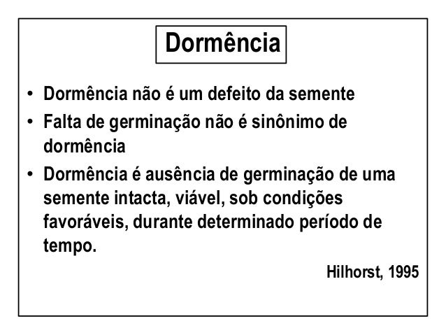 3. 3. Dormência • Dormência não é um defeito da semente • Falta de germinação não é sinônimo de dormência • Dormência é ausência de germinação de uma semente intacta, viável, sob condições favoráveis, durante determinado período de tempo. Hilhorst, 1995