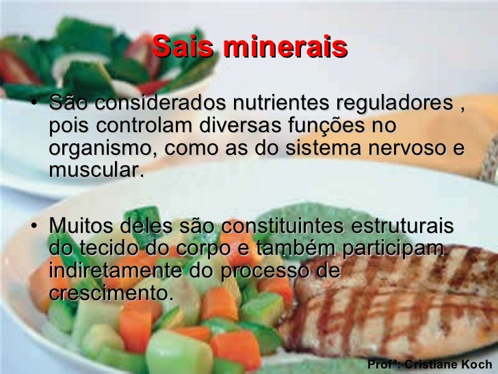 18. 18. Sais minerais <ul><li>São considerados nutrientes reguladores , pois controlam diversas funções no organismo, como as do sistema nervoso e muscular. </li></ul><ul><li>Muitos deles são constituintes estruturais do tecido do corpo e também participam indiretamente do processo de crescimento. </li></ul>Profª: Cristiane Koch