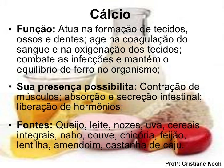 19. 19. Cálcio <ul><li>Função: Atua na formação de tecidos, ossos e dentes; age na coagulação do sangue e na oxigenação dos tecidos; combate as infecções e mantém o equilíbrio de ferro no organismo; </li></ul><ul><li>Sua presença possibilita: Contração de músculos; absorção e secreção intestinal; liberação de hormônios; </li></ul><ul><li>Fontes: Queijo, leite, nozes, uva, cereais integrais, nabo, couve, chicória, feijão, lentilha, amendoim, castanha de caju. </li></ul>Profª: Cristiane Koch