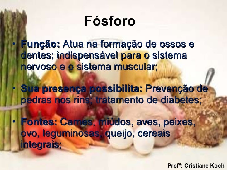 20. 20. Fósforo <ul><li>Função: Atua na formação de ossos e dentes; indispensável para o sistema nervoso e o sistema muscular; </li></ul><ul><li>Sua presença possibilita: Prevenção de pedras nos rins; tratamento de diabetes; </li></ul><ul><li>Fontes: Carnes, miúdos, aves, peixes, ovo, leguminosas, queijo, cereais integrais; </li></ul>Profª: Cristiane Koch