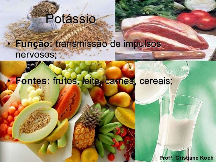 21. 21. Potássio <ul><li>Função: transmissão de impulsos nervosos; </li></ul><ul><li>Fontes: frutos, leite, carnes, cereais; </li></ul>Profª: Cristiane Koch