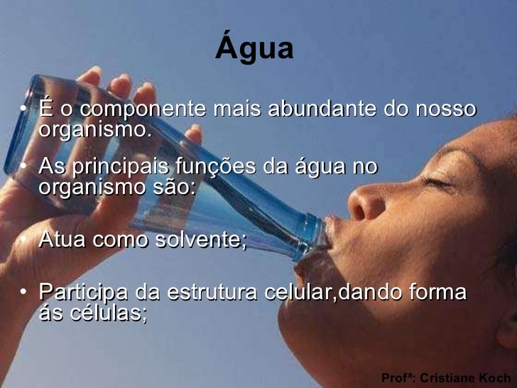 23. 23. Água <ul><li>É o componente mais abundante do nosso organismo. </li></ul><ul><li>As principais funções da água no organismo são: </li></ul><ul><li>Atua como solvente; </li></ul><ul><li>Participa da estrutura celular,dando forma ás células; </li></ul>Profª: Cristiane Koch