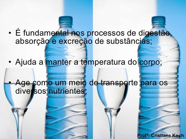 24. 24. <ul><li>É fundamental nos processos de digestão, absorção e excreção de substâncias; </li></ul><ul><li>Ajuda a manter a temperatura do corpo; </li></ul><ul><li>Age como um meio de transporte para os diversos nutrientes; </li></ul>Profª: Cristiane Koch