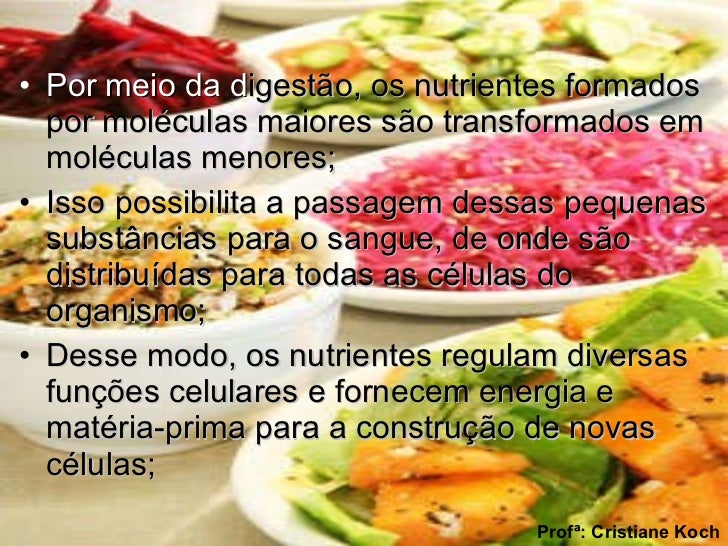 3. 3. <ul><li>Por meio da d igestão, os nutrientes formados por moléculas maiores são transformados em moléculas menores; </li></ul><ul><li>Isso possibilita a passagem dessas pequenas substâncias para o sangue, de onde são distribuídas para todas as células do organismo; </li></ul><ul><li>Desse modo, os nutrientes regulam diversas funções celulares e fornecem energia e matéria-prima para a construção de novas células; </li></ul>Profª: Cristiane Koch