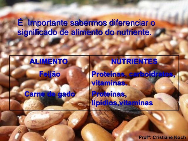 4. 4. É Importante sabermos diferenciar o significado de alimento do nutriente. Profª: Cristiane Koch ALIMENTO NUTRIENTES Feijão Proteínas, carboidratos, vitaminas. Carne de gado Proteínas, lipídios,vitaminas