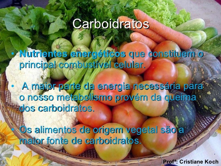 7. 7. Carboidratos <ul><li>Nutrientes energéticos que constituem o principal combustível celular. </li></ul><ul><li>A maior parte da energia necessária para o nosso metabolismo provém da queima dos carboidratos. </li></ul><ul><li>Os alimentos de origem vegetal são a maior fonte de carboidratos. </li></ul>Profª: Cristiane Koch