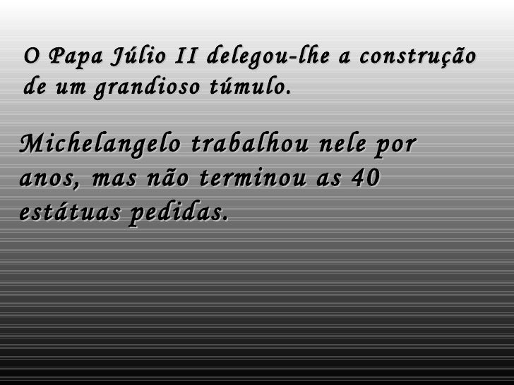 21. 22. O Papa Júlio II delegou-lhe a construção de um grandioso túmulo. Michelangelo trabalhou nele por anos, mas não terminou as 40 estátuas pedidas.