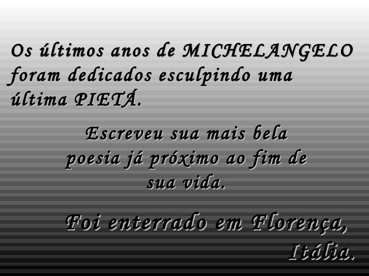 27. 28. Os últimos anos de MICHELANGELO foram dedicados esculpindo uma última PIETÁ. Escreveu sua mais bela poesia já próximo ao fim de sua vida. Foi enterrado em Florença, Itália.