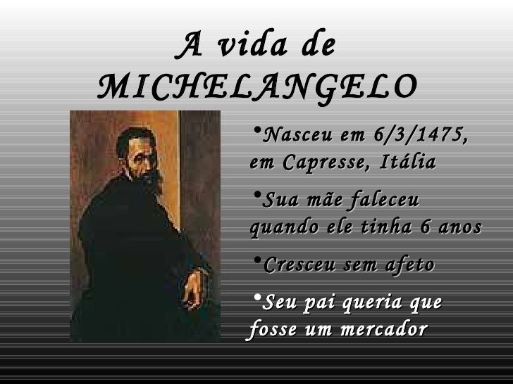 2. 3. A vida de MICHELANGELO <ul><li>Nasceu em 6/3/1475, em Capresse, Itália </li></ul><ul><li>Sua mãe faleceu quando ele tinha 6 anos </li></ul><ul><li>Cresceu sem afeto </li></ul><ul><li>Seu pai queria que fosse um mercador </li></ul>