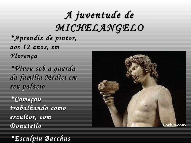 4. 5. A juventude de MICHELANGELO <ul><li>Aprendiz de pintor, aos 12 anos, em Florença </li></ul><ul><li>Viveu sob a guarda da família Médici em seu palácio </li></ul><ul><li>Começou trabalhando como escultor, com Donatello </li></ul><ul><li>Esculpiu Bacchus </li></ul>
