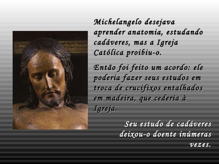 5. 6. Seu estudo de cadáveres deixou-o doente inúmeras vezes. Michelangelo desejava aprender anatomia, estudando cadáveres, mas a Igreja Católica proibiu-o. Então foi feito um acordo: ele poderia fazer seus estudos em troca de crucifixos entalhados em madeira, que cederia à Igreja.