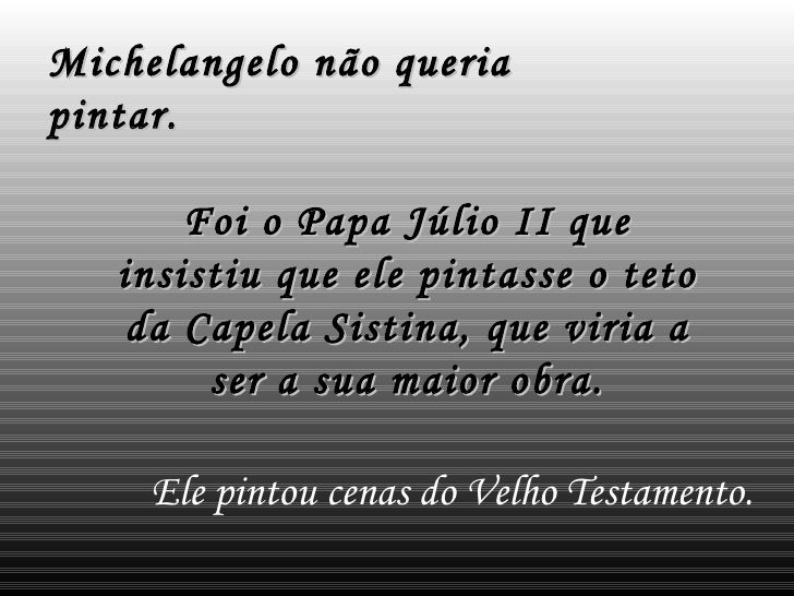 8. 9. Ele pintou cenas do Velho Testamento. Michelangelo não queria pintar. Foi o Papa Júlio II que insistiu que ele pintasse o teto da Capela Sistina, que viria a ser a sua maior obra.