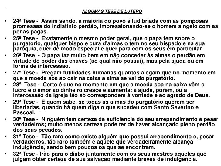 9. 9. . ALGUMAS TESE DE LUTERO• 24ª Tese - Assim sendo, a maioria do povo é ludibriada com as pomposas promessas do indistinto perdão, impressionando-se o homem singelo com as penas pagas.• 25ª Tese - Exatamente o mesmo poder geral, que o papa tem sobre o purgatório, qualquer bispo e cura dalmas o tem no seu bispado e na sua paróquia, quer de modo especial e quer para com os seus em particular.• 26ª Tese - O papa faz muito bem em não conceder às almas o perdão em virtude do poder das chaves (ao qual não possui), mas pela ajuda ou em forma de intercessão.• 27ª Tese - Pregam futilidades humanas quantos alegam que no momento em que a moeda soa ao cair na caixa a alma se vai do purgatório.• 28ª Tese - Certo é que no momento em que a moeda soa na caixa vêm o lucro e o amor ao dinheiro cresce e aumenta; a ajuda, porém, ou a intercessão da Igreja tão só correspondem à vontade e ao agrado de Deus.• 29ª Tese - E quem sabe, se todas as almas do purgatório querem ser libertadas, quando há quem diga o que sucedeu com Santo Severino e Pascoal.• 30ª Tese - Ninguém tem certeza da suficiência do seu arrependimento e pesar verdadeiros; muito menos certeza pode ter de haver alcançado pleno perdão dos seus pecados.• 31ª Tese - Tão raro como existe alguém que possui arrependimento e, pesar verdadeiros, tão raro também é aquele que verdadeiramente alcança indulgência, sendo bem poucos os que se encontram.• 32ª Tese - Irão para o diabo juntamente com os seus mestres aqueles que julgam obter certeza de sua salvação mediante breves de indulgência.