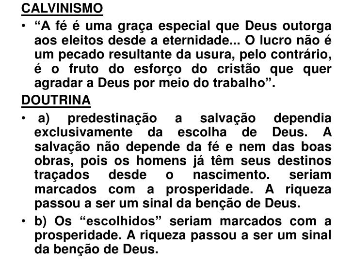 CALVINISMO• “A fé é uma graça especial que Deus outorga  aos eleitos desde a eternidade... O lucro não é  um pecado result...