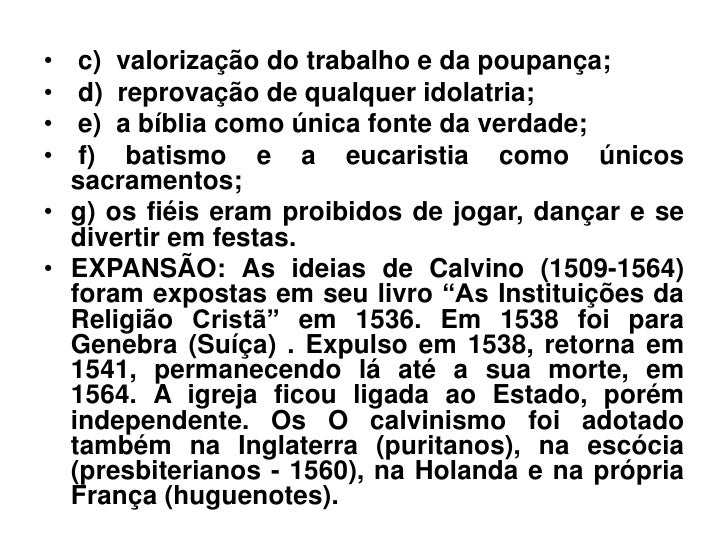 12. 12. • c) valorização do trabalho e da poupança;• d) reprovação de qualquer idolatria;• e) a bíblia como única fonte da verdade;• f) batismo e a eucaristia como únicos sacramentos;• g) os fiéis eram proibidos de jogar, dançar e se divertir em festas.• EXPANSÃO: As ideias de Calvino (1509-1564) foram expostas em seu livro “As Instituições da Religião Cristã” em 1536. Em 1538 foi para Genebra (Suíça) . Expulso em 1538, retorna em 1541, permanecendo lá até a sua morte, em 1564. A igreja ficou ligada ao Estado, porém independente. Os O calvinismo foi adotado também na Inglaterra (puritanos), na escócia (presbiterianos - 1560), na Holanda e na própria França (huguenotes).