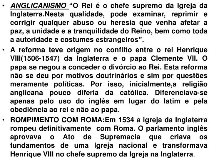 13. 13. • ANGLICANISMO “O Rei é o chefe supremo da Igreja da Inglaterra.Nesta qualidade, pode examinar, reprimir e corrigir qualquer abuso ou heresia que venha afetar a paz, a unidade e a tranquilidade do Reino, bem como toda a autoridade e costumes estrangeiros”.• A reforma teve origem no conflito entre o rei Henrique VIII(1506-1547) da Inglaterra e o papa Clemente VII. O papa se negou a conceder o divórcio ao Rei. Esta reforma não se deu por motivos doutrinários e sim por questões meramente políticas. Por isso, inicialmente,a religião anglicana pouco diferia da católica. Diferenciava-se apenas pelo uso do inglês em lugar do latim e pela obediência ao rei e não ao papa.• ROMPIMENTO COM ROMA:Em 1534 a igreja da Inglaterra rompeu definitivamente com Roma. O parlamento inglês aprovava o Ato de Supremacia que criava os fundamentos de uma Igreja nacional e transformava Henrique VIII no chefe supremo da Igreja na Inglaterra.