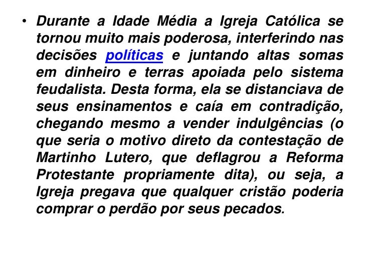 3. 3. • Durante a Idade Média a Igreja Católica se tornou muito mais poderosa, interferindo nas decisões políticas e juntando altas somas em dinheiro e terras apoiada pelo sistema feudalista. Desta forma, ela se distanciava de seus ensinamentos e caía em contradição, chegando mesmo a vender indulgências (o que seria o motivo direto da contestação de Martinho Lutero, que deflagrou a Reforma Protestante propriamente dita), ou seja, a Igreja pregava que qualquer cristão poderia comprar o perdão por seus pecados.