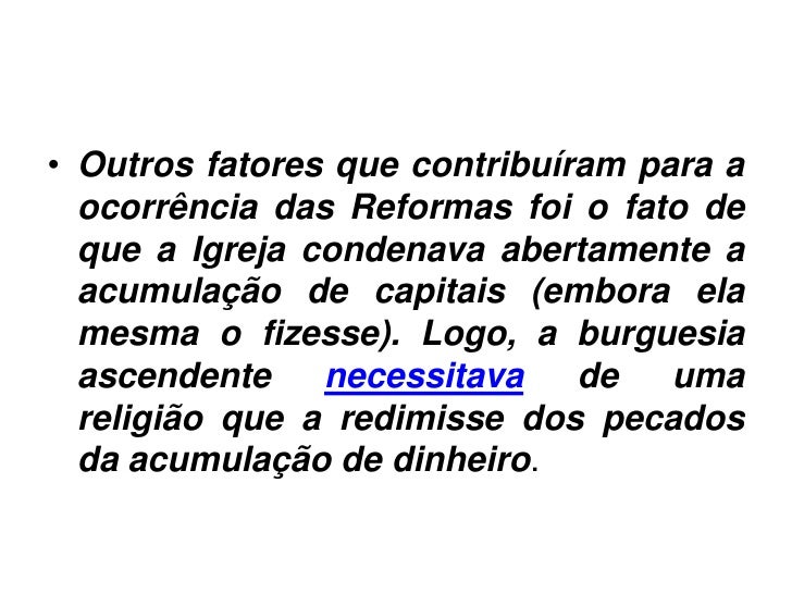 4. 4. • Outros fatores que contribuíram para a ocorrência das Reformas foi o fato de que a Igreja condenava abertamente a acumulação de capitais (embora ela mesma o fizesse). Logo, a burguesia ascendente necessitava de uma religião que a redimisse dos pecados da acumulação de dinheiro.