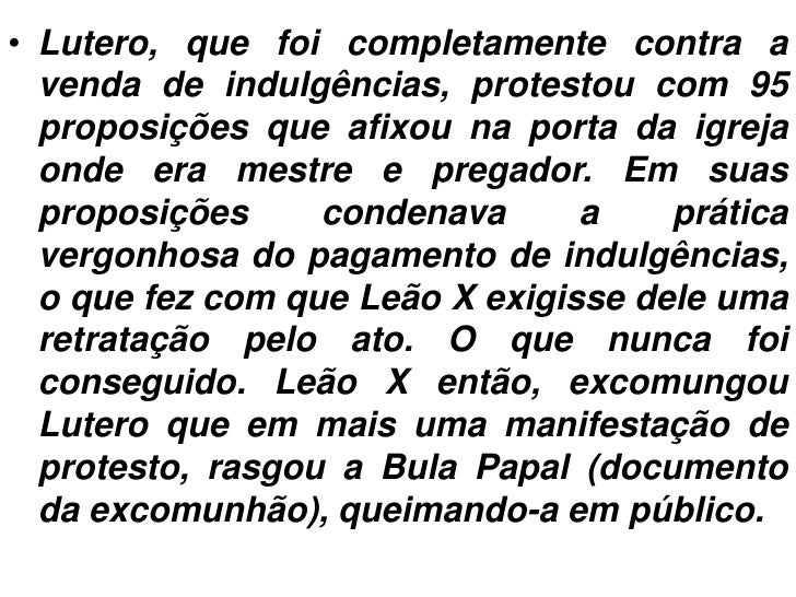 5. 5. • Lutero, que foi completamente contra a venda de indulgências, protestou com 95 proposições que afixou na porta da igreja onde era mestre e pregador. Em suas proposições condenava a prática vergonhosa do pagamento de indulgências, o que fez com que Leão X exigisse dele uma retratação pelo ato. O que nunca foi conseguido. Leão X então, excomungou Lutero que em mais uma manifestação de protesto, rasgou a Bula Papal (documento da excomunhão), queimando-a em público.