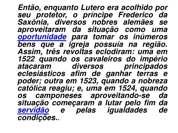 6. 6. Então, enquanto Lutero era acolhido porseu protetor, o príncipe Frederico daSaxônia, diversos nobres alemães seaproveitaram da situação como umaoportunidade para tomar os inúmerosbens que a igreja possuía na região.Assim, três revoltas eclodiram: uma em1522 quando os cavaleiros do impérioatacaram diversos principadoseclesiásticos afim de ganhar terras epoder; outra em 1523, quando a nobrezacatólica reagiu; e, uma em 1524, quandoos camponeses aproveitando-se dasituação começaram a lutar pelo fim daservidão e pelas igualdades decondições..