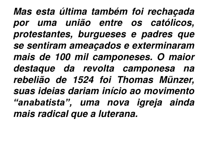 7. 7. Mas esta última também foi rechaçadapor uma união entre os católicos,protestantes, burgueses e padres quese sentiram ameaçados e exterminarammais de 100 mil camponeses. O maiordestaque da revolta camponesa narebelião de 1524 foi Thomas Münzer,suas ideias dariam início ao movimento“anabatista”, uma nova igreja aindamais radical que a luterana.