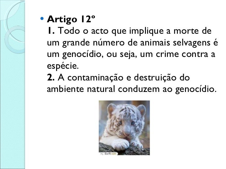 13. 13. <ul><li>Artigo 12º 1. Todo o acto que implique a morte de um grande número de animais selvagens é um genocídio, ou seja, um crime contra a espécie. 2. A contaminação e destruição do ambiente natural conduzem ao genocídio. </li></ul>