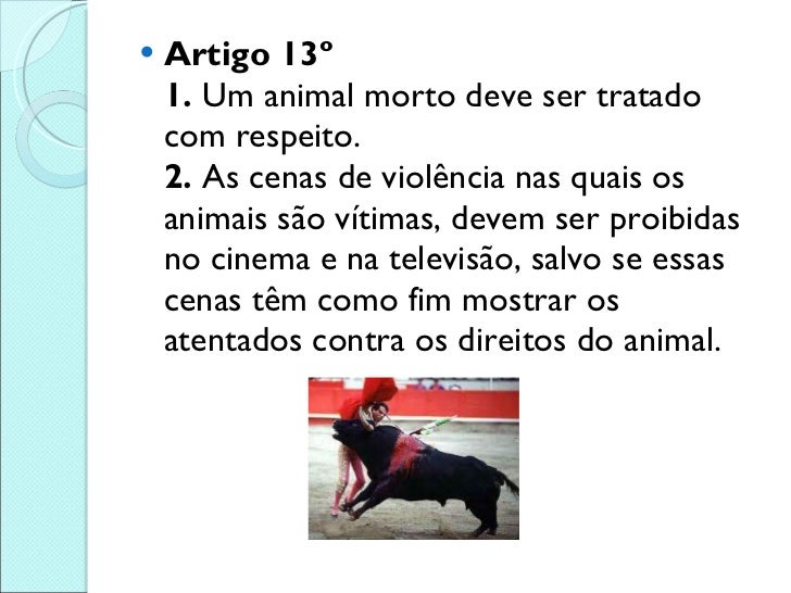 14. 14. <ul><li>Artigo 13º 1. Um animal morto deve ser tratado com respeito. 2. As cenas de violência nas quais os animais são vítimas, devem ser proibidas no cinema e na televisão, salvo se essas cenas têm como fim mostrar os atentados contra os direitos do animal. </li></ul>