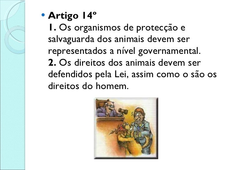 15. 15. <ul><li>Artigo 14º 1. Os organismos de protecção e salvaguarda dos animais devem ser representados a nível governamental. 2. Os direitos dos animais devem ser defendidos pela Lei, assim como o são os direitos do homem. </li></ul>