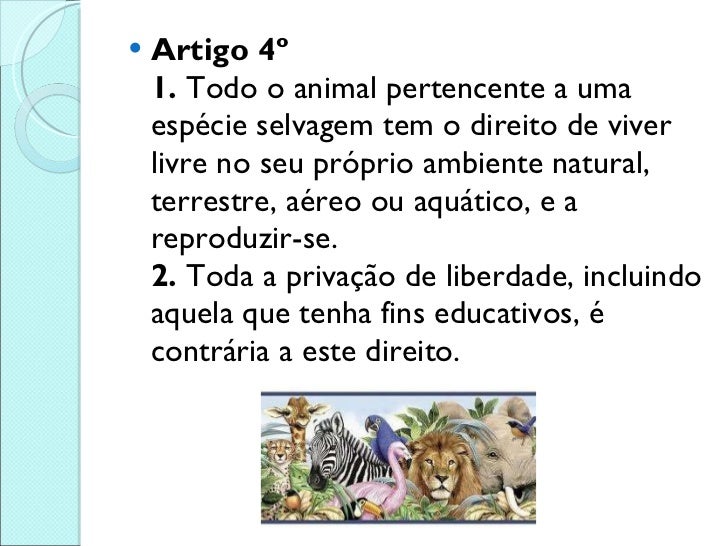 5. 5. <ul><li>Artigo 4º 1. Todo o animal pertencente a uma espécie selvagem tem o direito de viver livre no seu próprio ambiente natural, terrestre, aéreo ou aquático, e a reproduzir-se. 2. Toda a privação de liberdade, incluindo aquela que tenha fins educativos, é contrária a este direito. </li></ul>