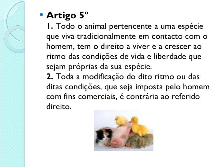 6. 6. <ul><li>Artigo 5º 1. Todo o animal pertencente a uma espécie que viva tradicionalmente em contacto com o homem, tem o direito a viver e a crescer ao ritmo das condições de vida e liberdade que sejam próprias da sua espécie. 2. Toda a modificação do dito ritmo ou das ditas condições, que seja imposta pelo homem com fins comerciais, é contrária ao referido direito. </li></ul>