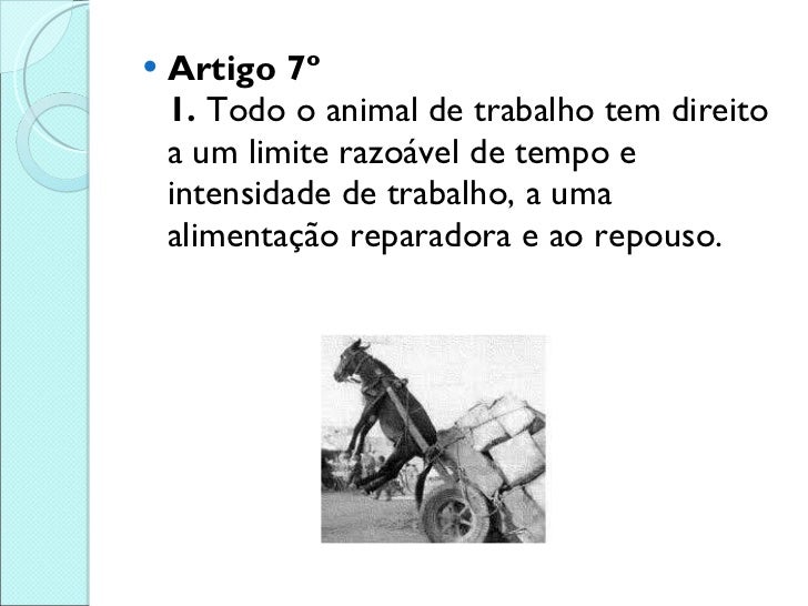 8. 8. <ul><li>Artigo 7º 1. Todo o animal de trabalho tem direito a um limite razoável de tempo e intensidade de trabalho, a uma alimentação reparadora e ao repouso. </li></ul>