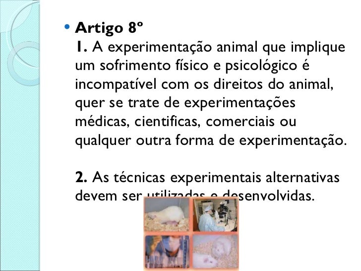9. 9. <ul><li>Artigo 8º 1. A experimentação animal que implique um sofrimento físico e psicológico é incompatível com os direitos do animal, quer se trate de experimentações médicas, cientificas, comerciais ou qualquer outra forma de experimentação. 2. As técnicas experimentais alternativas devem ser utilizadas e desenvolvidas. </li></ul>