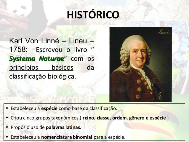 2. 2. HISTÓRICO Karl Von Linné – Lineu – 1758: Escreveu o livro “ Systema Naturae” com os Naturae princípios básicos da classificação biológica.• Estabeleceu a espécie como base da classificação.• Criou cinco grupos taxonômicos ( reino, classe, ordem, gênero e espécie )• Propôs o uso de palavras latinas.• Estabeleceu a nomenclatura binomial para a espécie.