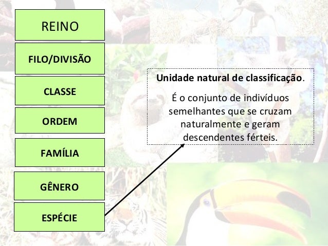 4. 4. REINOFILO/DIVISÃO Unidade natural de classificação. CLASSE É o conjunto de indivíduos semelhantes que se cruzam ORDEM naturalmente e geram descendentes férteis. FAMÍLIA GÊNERO ESPÉCIE