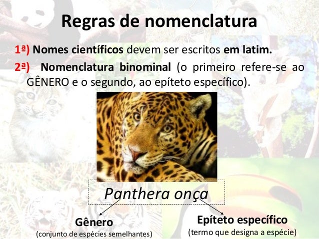 5. 5. Regras de nomenclatura1ª) Nomes científicos devem ser escritos em latim.2ª) Nomenclatura binominal (o primeiro refere-se ao GÊNERO e o segundo, ao epíteto específico). Panthera onça Gênero Epíteto específico (conjunto de espécies semelhantes) (termo que designa a espécie)