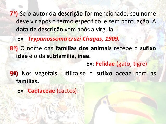 7. 7. 7ª) Se o autor da descrição for mencionado, seu nome deve vir após o termo específico e sem pontuação. A data de descrição vem após a vírgula. Ex: Trypanossoma cruzi Chagas, 1909.8ª) O nome das famílias dos animais recebe o sufixo idae e o da subfamília, inae. Ex: Felidae (gato, tigre)9ª) Nos vegetais, utiliza-se o sufixo aceae para as famílias. Ex: Cactaceae (cactos).